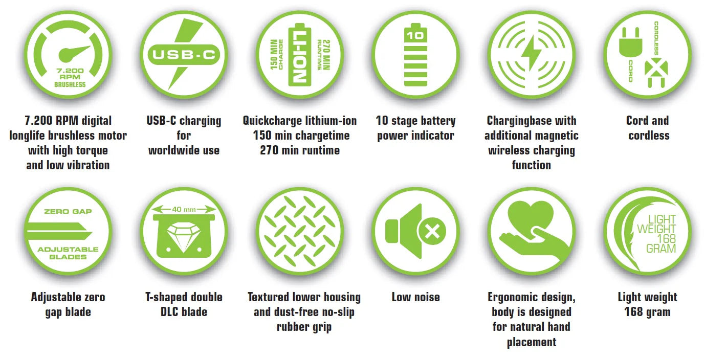 Kracht en precisie in één De Assassin Trimmer is voorzien van een digitale borstelloze motor met 7.200 toeren per minuut, waardoor hij uitzonderlijk constant presteert en nauwelijks trilt. Het 40 mm DLC T-blade, instelbaar op zero gap, levert extreem scherpe lijnen en details, en maakt perfecte afwerkingen mogelijk – zelfs op moeilijk te bereiken plekken.