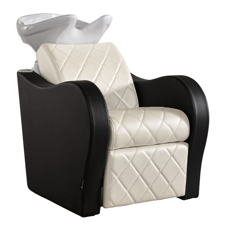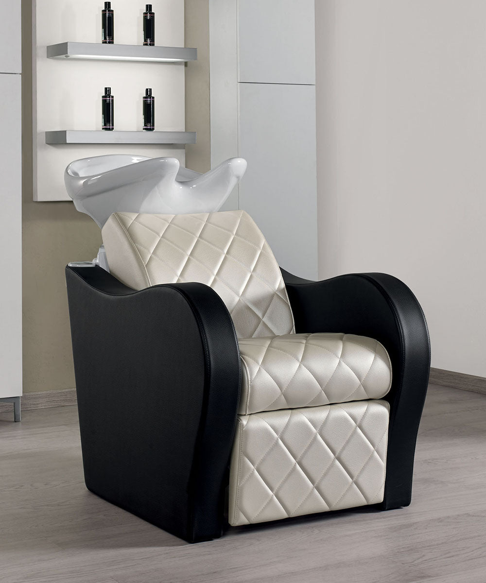 De vormgeving van de Luxury+ is modern en licht gebogen, waardoor de wasunit een rustige en professionele uitstraling heeft in de salon. De afwerking met cross stitching (kruisstiksel) op de rug en zitting zorgt voor een subtiel luxe detail dat direct opvalt zonder overdreven te zijn.
